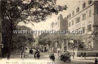 Rue Maghrabi, avec au premier plan l'hôtel d'Angleterre et au second le Grand Temple d'Ismailieh, vers 1906. |