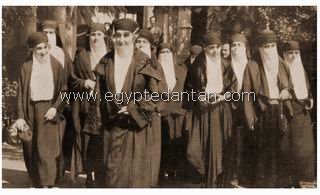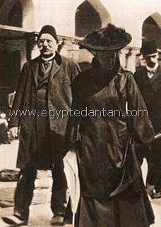 L'impératrice Eugénie visitant la mosquée El-Azhar, accompagnée par Hassan Assem pacha, Grand-Maître des Cérémonies et de Said Zoulficar Bey.Cliché de 1903. |