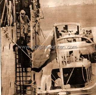 L'ex-roi Victor Emmanuel III et son épouse le reine Hélène arrivent à Alexandrie en Mai 1946 ayant quitté définitivement l'Italie après l'abdication du vieux souverain. Ils ne reverront plus jamais leur pays. Sur ce document on voit les souverains quittant le croiseur militaire italien Duc des Abruzzes et s'embarquant dans la vedette du roi d'Egypte pour accoster au port d'Alexandrie. |