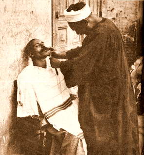 Les petits métiers du Caire en 1924. Le barbier et son client. Cliché Burton Holmes. |