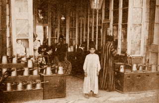 Magasin de repassage de tarbouches au Caire, en 1924.Un élégant se faisait repasser son tarbouche une fois par semaine. Cliché Burton Holmes. |